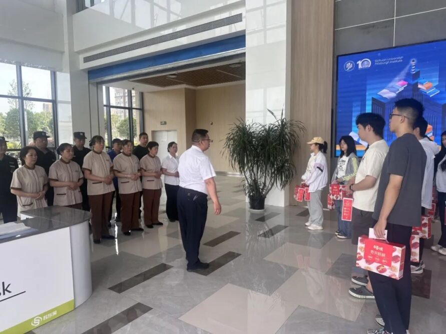 At the beginning of the activity, Yang Yuan, the property manager, introduced the composition of the workers for SCUPI. Subsequently, volunteers delivered carefully prepared greeting cards and gifts to staff members in security, cleaning, landscaping, and maintenance. Each greeting card carried the students’ respect and blessings for the workers, and each gift conveyed warmth and care in full.