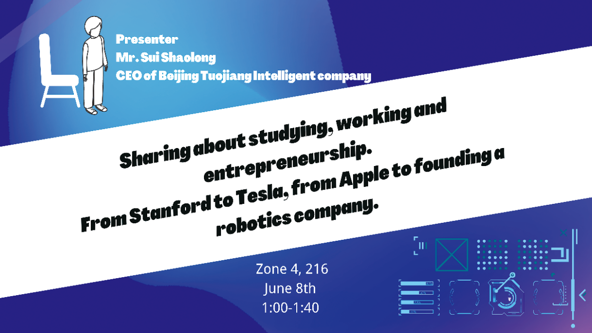 Lecture from Mr. Sui Shaolong: Sharing about studying, working and entrepreneurship. From Stanford to Tesla, from Apple to founding a robotic company.