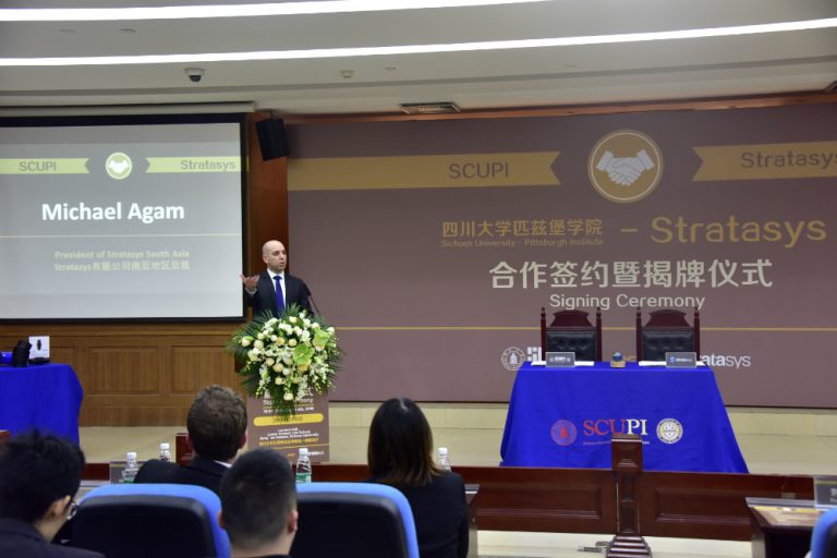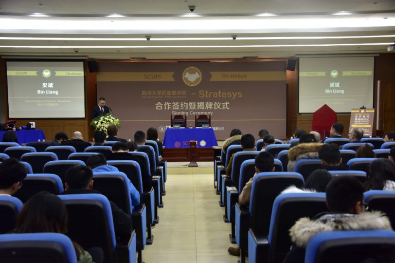 On March 6, 2019, the Sichuan University – Pittsburgh Institute (SCUPI) – Stratasys Signing Ceremony was held at the Lecture Hall, Law School, Jiang’an Campus, Sichuan University (SCU).