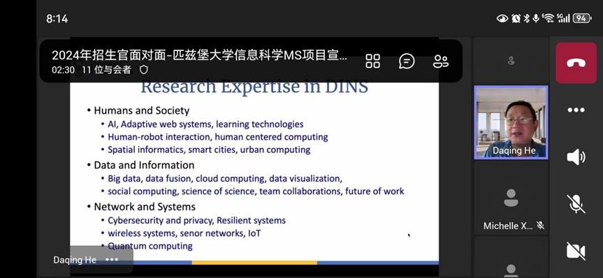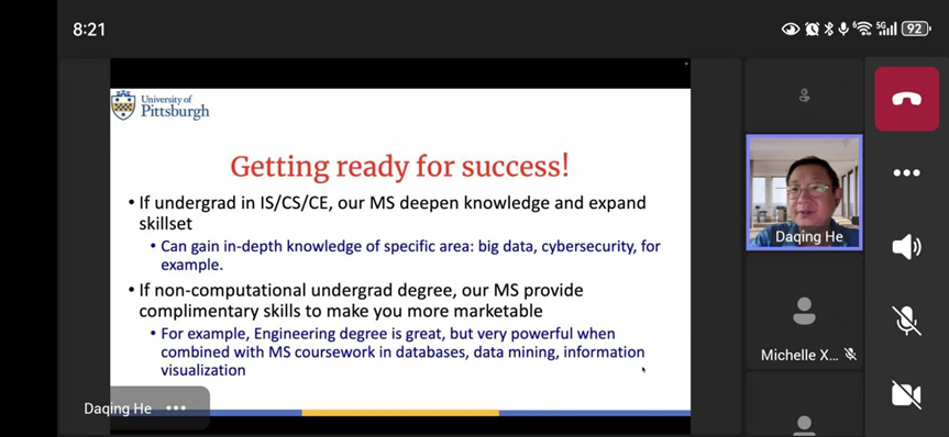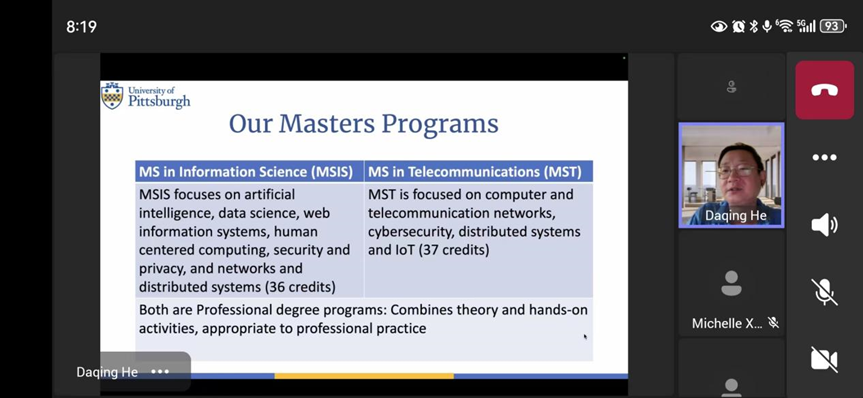 In the evening of July 2, 2024 (Tuesday), from 20:00 to 21:00, the Career Advising Group (CA) of the University of Sichuan-Pittsburgh Institute successfully hosted an online seminar for the Master of Science (MS) program in Information Science at the University of Pittsburgh.
