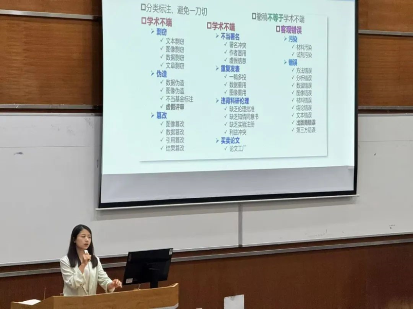 To help students recognize and prevent academic misconduct, Ms. Zhou used specific examples to analyze common violations, such as plagiarism, data fabrication, improper authorship, and duplicate submissions. To avoid such issues, she recommended respecting intellectual property, citing sources properly, and using plagiarism-checking software to ensure originality.
